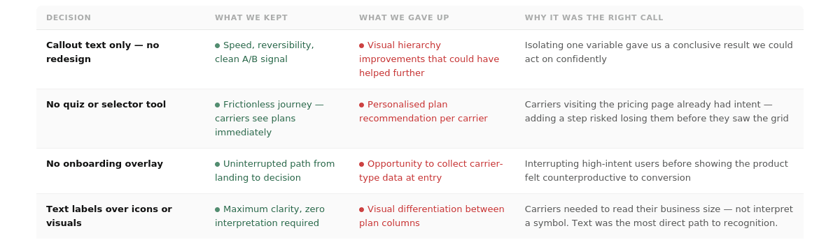 It would be easy to frame these constraints as things that limited what we could do. But looking back, they did the opposite, they forced precision. If a minimal, reversible, 2-day change could move revenue by 16%, it proved the problem was informational, not structural. We didn't need to rebuild the pricing page. We needed to surface the right information at the right moment. The constraints kept us focused on that insight rather than letting us default to a bigger solution that would have been harder to measure and slower to ship.