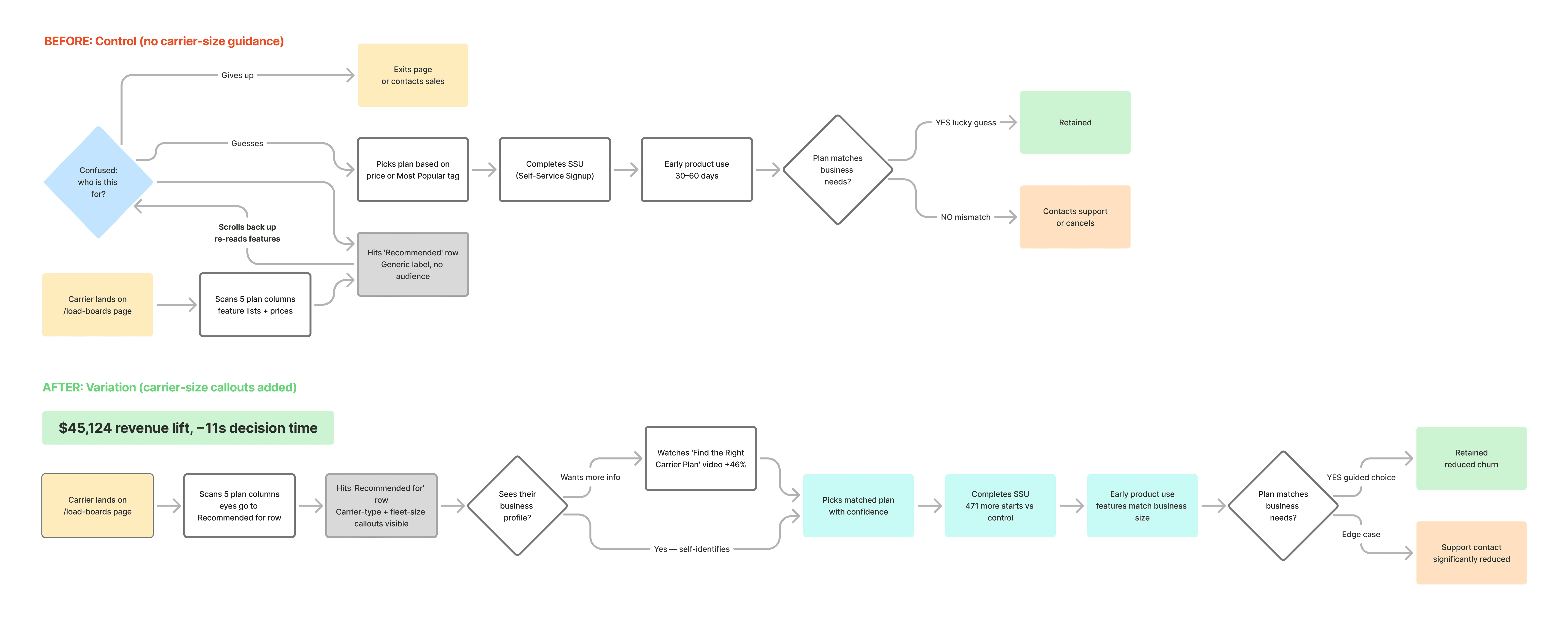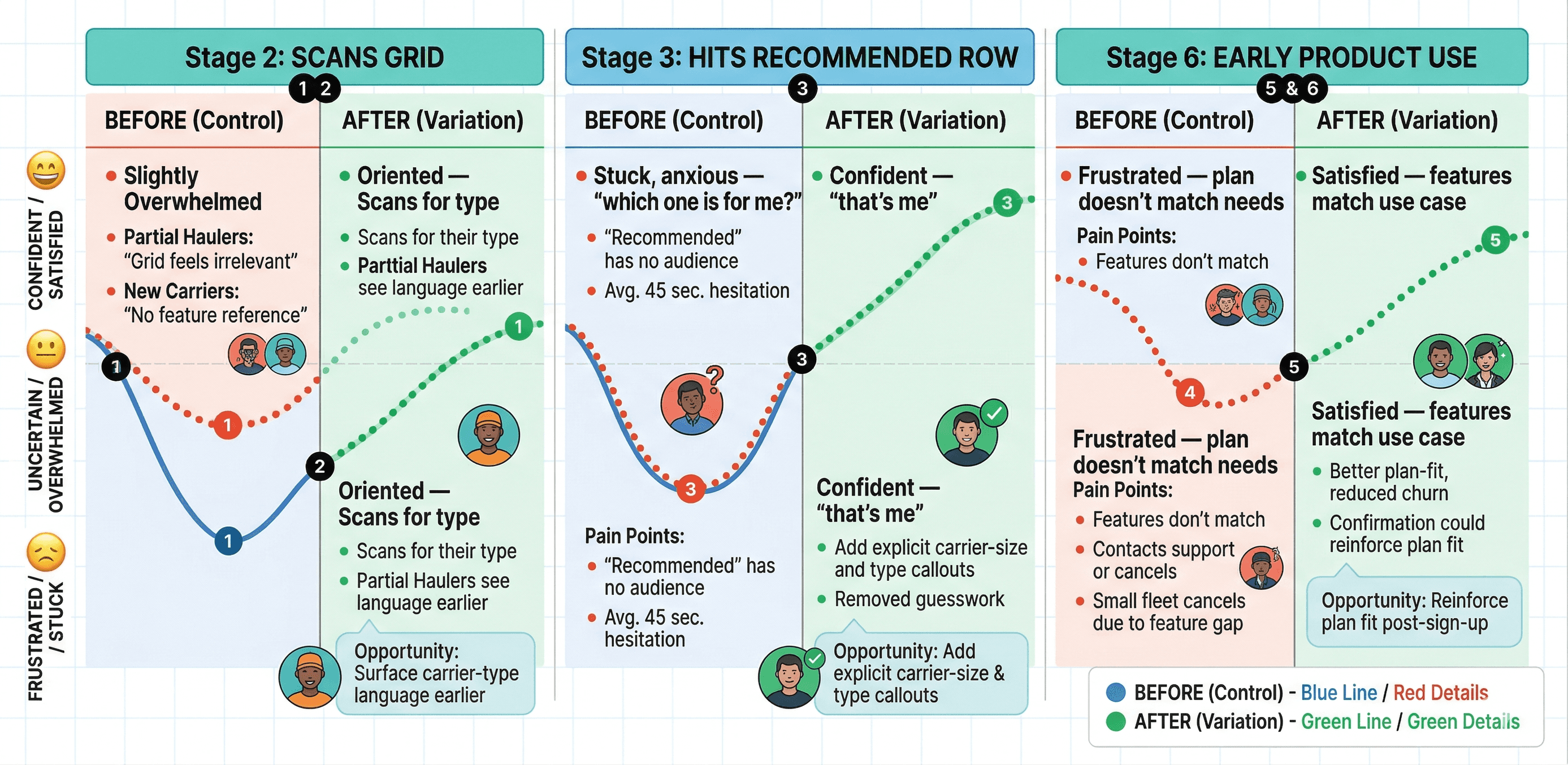 Stage 3 (Hits "Recommended" row) was the critical friction point, peak confusion for all four carrier types, 45 seconds average hesitation, highest exit risk. The design change targeted this exact moment.