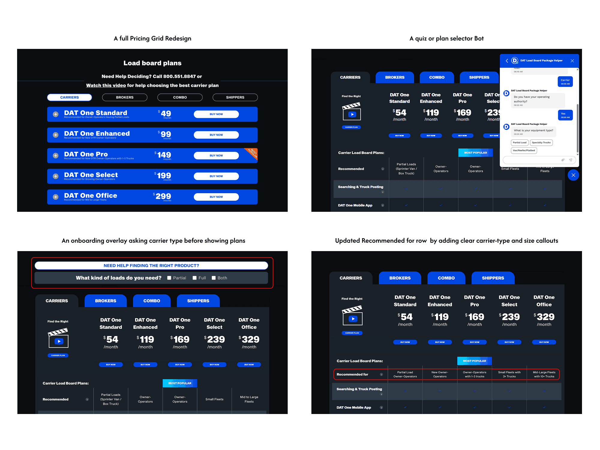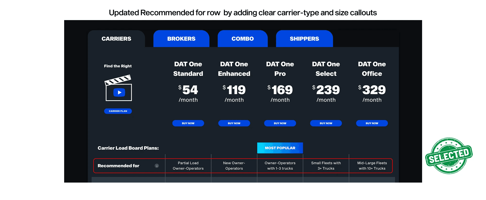 Hypothesis: If we simplify the mental model by adding explicit "Carrier-Type" callouts (e.g., "1-5 Trucks" vs. "Growing Fleets"), then we will reduce the cognitive load, leading to faster confidence in plan selection and higher conversion rates.